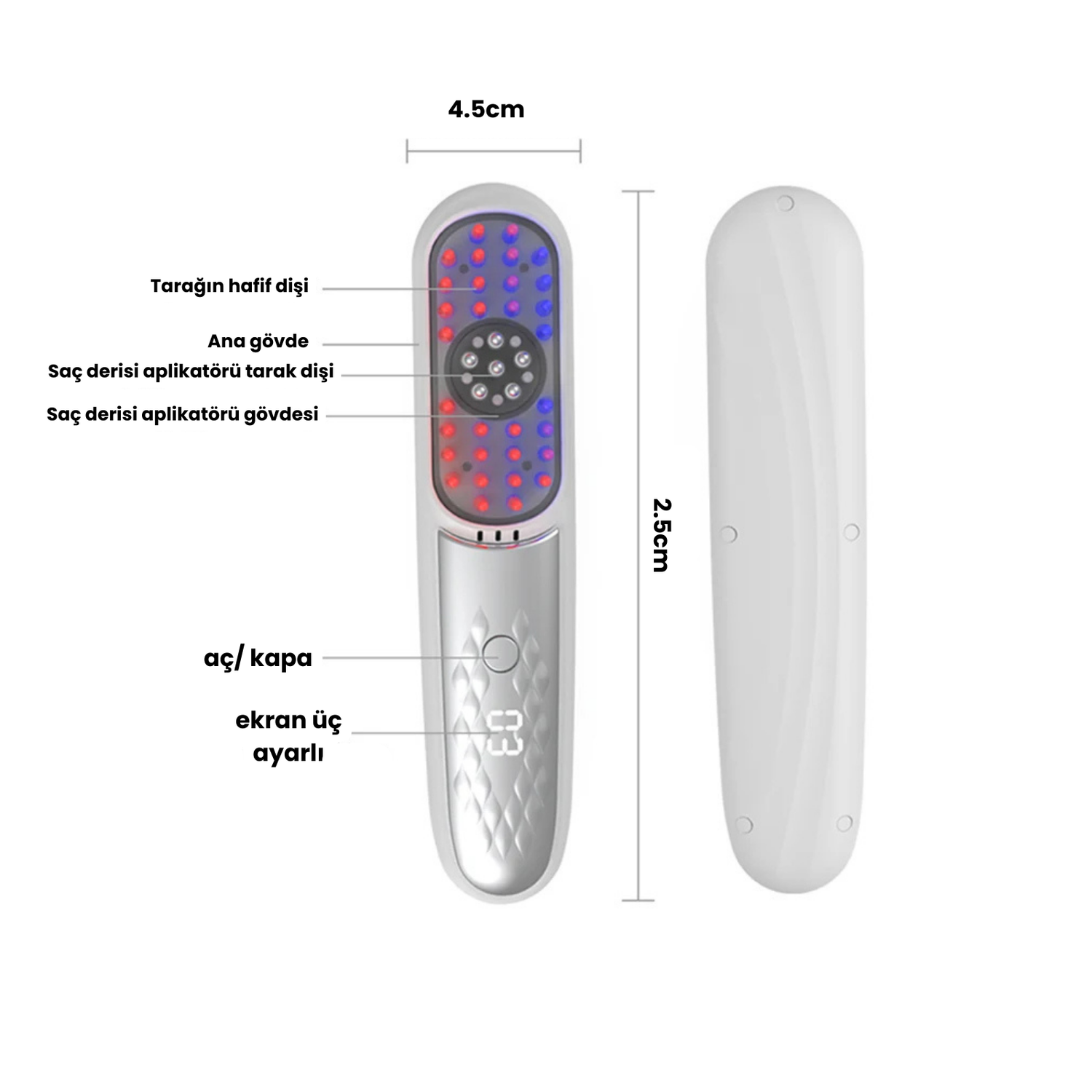 Kırmızı ışık saç köklerini uyararak büyümeyi destekler, mavi ışık ise saç derisindeki bakterileri azaltır ve kepek gibi problemleri önler.