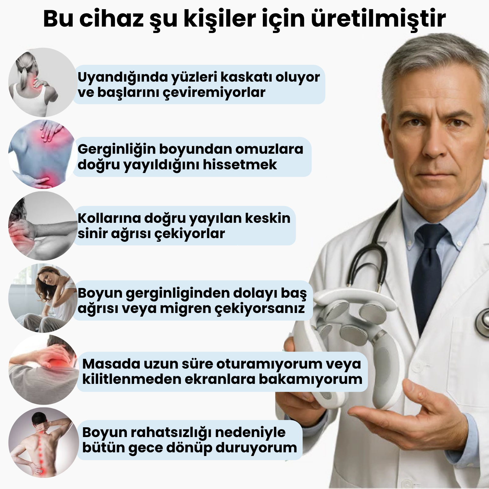 NeckPro sadece bir masaj aleti değil; sinir sistemini yatıştıran, boyun gerginliğini çözen ve uyku kaliteni artıran akıllı bir terapi cihazı. Günlük stres, masa başı yorgunluğu ve ekran karşısında geçen uzun saatler… Hepsine karşı evde ya da ofiste, her an yanında. Fizyoterapist kadar etkili! Boyun ağrısı, kas tutulması, stres ve uykusuzlukla başa çıkmak artık daha kolay. NeckPro düzenli kullanımda alışkanlığa dönüşür; bedenini rahatlatır, zihnini yeniler.